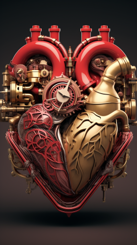 A large heart-shaped sculpture with its pointed bottom pressing down on a man's chest as he lies beneath it. The man is lying on his back, with the tip of the heart piercing his chest, symbolizing emotional pressure. The art style is collage-like, with layered textures and cut-out shapes. The colors of the heart and the man are in soft pastel tones, contrasting with a dark, moody background to enhance the tension. The overall atmosphere should feel surreal and abstract. --ar 16:9 --s 750