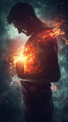 create an image of a man with his stomach hurting in high resolution super hd ai style --ar 9:16
