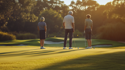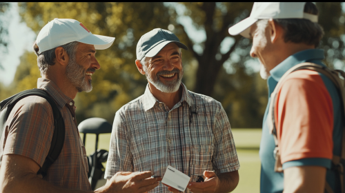 Create an image featuring mid-30s to late-40s golfers who are focused on reducing the costs associated with golfing. The scene should depict a relaxed and friendly environment, such as a golf course or clubhouse, where these golfers are shown exploring cost-saving options. Include visual elements like discount vouchers, special offers, or promotions prominently displayed. The golfers should be dressed in casual golf attire, smiling and discussing these deals, reflecting their interest in affordable golfing. The overall mood should be approachable, emphasizing practicality, value, and enjoyment of the sport, super realistic, UHD, future, Cinematic, Photography, Ultra - Wide Angle, Depth of Field, hyper - detailed, insane details, intricate details, beautifully color graded, Unreal Engine 5, Cinematic, Photoshoot, Shot on 25mm lens, Depth of Field, DOF, Tilt Blur, Shutter Speed 1/ 1000, F/ 22, White Balance, 32k, Super - Resolution, Megapixel, Pro Photo RGB, VR, Good, Massive, Half rear Lighting, Backlight, Natural Lighting, Incandescent, Optical Fiber, Moody Lighting, Cinematic Lighting, Studio Lighting, Soft Lighting, Volumetric, Conte - Jour, Beautiful Lighting, Accent Lighting, Global Illumination, Screen Space Global Illumination, Ray Tracing Global Illumination, Optics, Scattering, Glowing, Shadows, Rough, Shimmering, Ray Tracing Reflections, Lumen Reflections, Screen Space Reflections, Diffraction Grading, Chromatic Aberration, GB Displacement, Scan Lines, Ray Traced, Ray Tracing Ambient Occlusion, Anti - Aliasing, FKAA, TXAA, RTX, SSAO, Shaders, OpenGL - Shaders, GLSL - Shaders, Post Processing, Post - Production, Cell Shading, Tone Mapping, CGI, VFX, SFX, insanely detailed and intricate, hyper maximalist, elegant, super detailed, dynamic pose, photography, [...]
