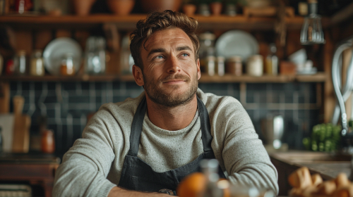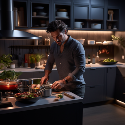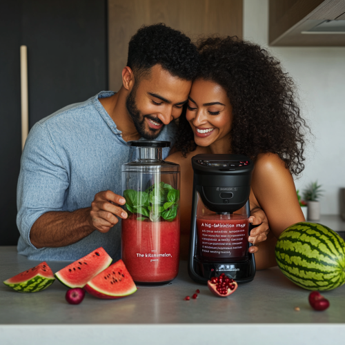 A super realistic image of a man in his mid-30s, standing in a sleek, modern kitchen, holding a glass of freshly made beet juice. The rich red color of the juice contrasts with the clean, minimalistic background. His face shows a look of satisfaction and strength, as the juice symbolizes health and performance.