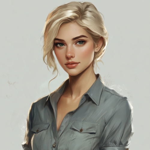 character art. Digital art. Western theme. Blonde hair that hands down. women in her mid 30s with a grey button shirt with the sleeves rolled up. The collar would be u buttoned with some leverage. Natural makeup look