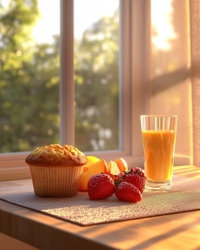 Visualize a cozy kitchen table illuminated by warm, golden morning light filtering through large windows. The table is set with a simple yet elegant placemat, and in a front-facing perspective, there is a clear glass of vibrant orange juice and a freshly baked muffin. Beside them, a small assortment of fresh fruits, such as strawberries and sliced apples, adds a burst of color to the scene. The soft light enhances the textures of the muffin, the condensation on the glass, and the natural beauty of the fruits, creating an inviting and serene breakfast atmosphere in a minimalist kitchen. --v 6.1 --ar 4:5