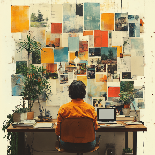 Create a picture of a person in their mid-30s on the subject of office work versus home office with collage-like elements as if cut out of a magazine with scissors and reassembled by hand, in a mixture of real photos and illustrations, in contrasting colours and typical elements of desk work such as laptop, potted plant, table lamp, notebook, pens and office furniture such as desk and chair. --s 750 --v 6.1