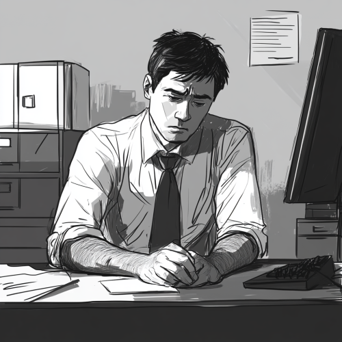 a guy in his mid 30s sitting at his desk in a corporate job. He is dejected. His live has no purpose or meaning. He feels trapped. He is wearing a button up shirt with a tie.