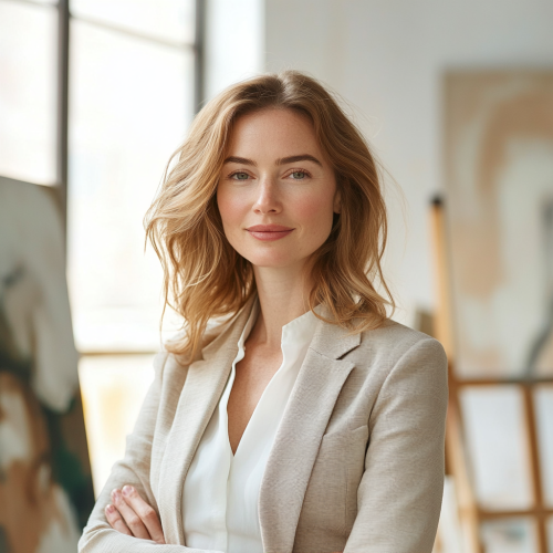 Create a realistic portrait of a Caucasian woman in her mid-30s with light brown hair styled in soft waves. She is standing in a bright, minimalist studio with natural light filtering in through large windows. She’s wearing a stylish beige blazer over a white blouse. The background shows some abstract art canvases in progress, giving the scene a creative, artistic vibe.