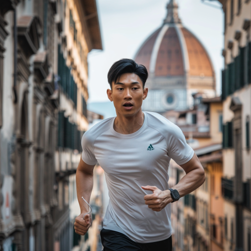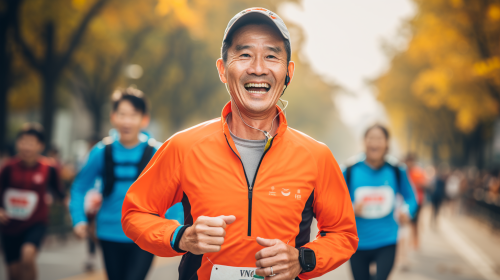 A man in his 50s in Asia is running a marathon. Next to him, the pacemaker is running with a bright face. The pacemaker is a man in his 30s. --ar 16:9 --style raw