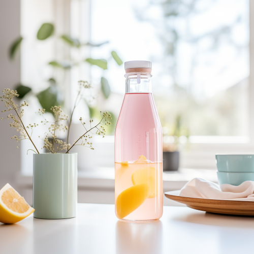 glass juice bottle on a kitchen counter, modern scandanavian decor, light pastels ultra reaslistic, product photography