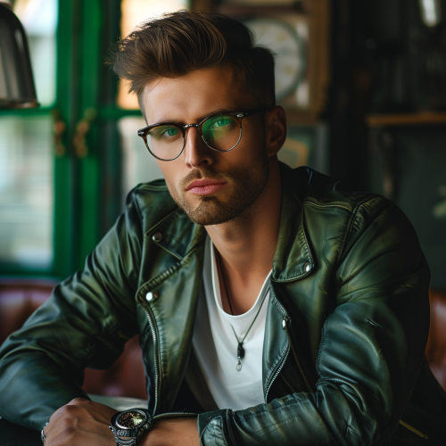male mid 30s, attractive, white tshirt, green leather funky jacket opened, brown hair glasses, background green tones cafe, ultra realistic, photography --v 6.0