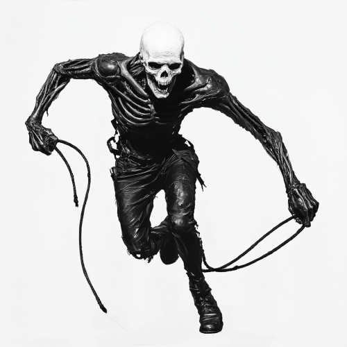 creature, very skinny human body, skullface, is running towards camera, looking angrily, white background, wearing leatherclothing, holding rope in one hand