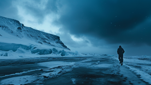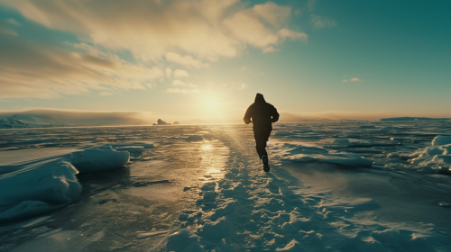 still image from a scene, a man running from the horizon in Antarctica and looking back in terror, dusk scene, kodak vision3 250d --ar 16:9 --v 6.0