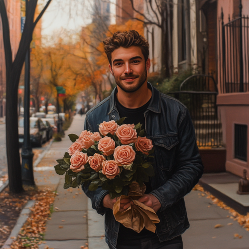 Create a hyper realistic portrait of a handsome man carrying a bouquet of roses that are made of milk chocolate candy to give to his girlfriend. The roses are milk chocolate color. He is walking down a neighborhood sidewalk with a smile on his face. It is a cool autumn afternoon in the Bronx. --v 6.1
