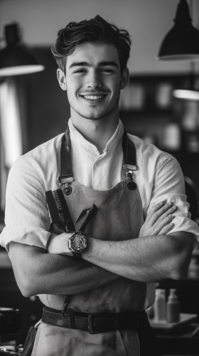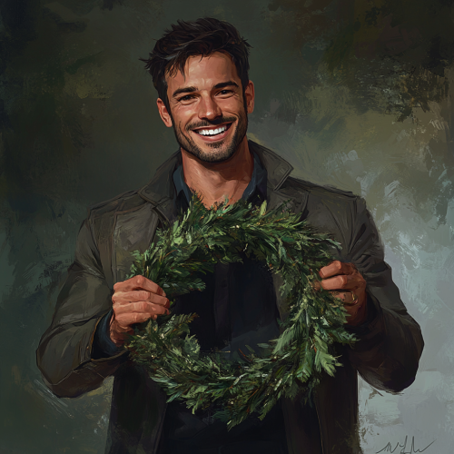 a high-quality, realistic handsome man that is smiling and holding a wreath out in front of him like he is showing it off. The wreath should be lower on his body by the waist area
