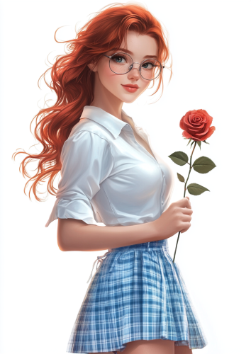 Adorable redhead girl with glasses, wearing a white shirt and blue and white checkered skirt, holding a 1 rose, in a full pose on a white background in the style of digital art. --ar 91:128 --v 6.1