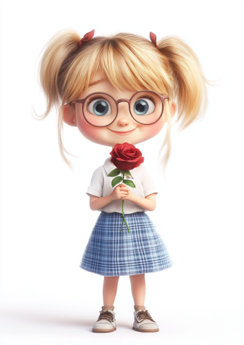 Adorable, happy blonde hair little girl with glasses, wearing a white shirt and blue checkered skirt, holding a 1 rose, in a full pose on a white background in the style of digital art. --ar 91:128 --v 6.1