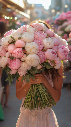 Woman holding large bouquet of peonies and roses at flower market, flowers naturally covering face, wearing sundress, morning market lighting, lifestyle photography --ar 9:16 --style raw --s 250