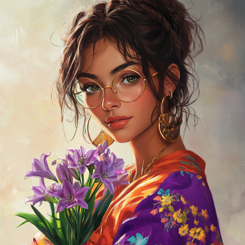 a mexican woman around 20 years old, with chocolate hair in a messy bun, round face, round glasses, mossy green eyes, dressed colorful holding a bouquet of liliac