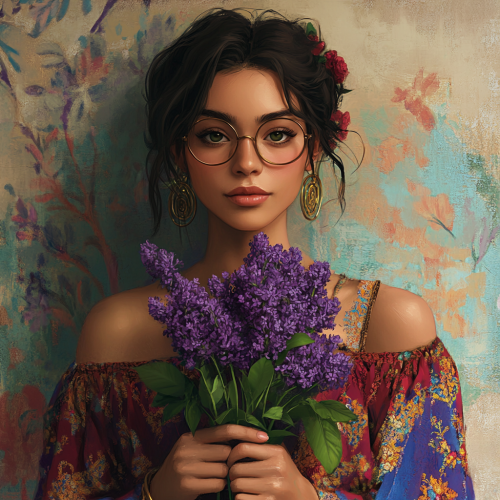 a mexican woman around 20 years old, with chocolate hair in a messy bun, round face, round glasses, mossy green eyes, dressed colorful holding a bouquet of lilac