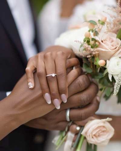 a photo of a hand of black bride and groom, wearing simple ring, focus bride's hand, holding wedding bouquet, wide shot, color photo --ar 4:5 --no face