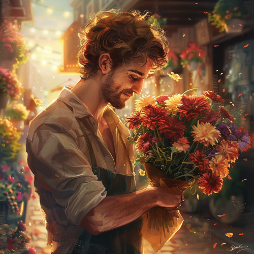 Create a beautiful hyper realistic rose made out of milk chocolate. Then create a bouquet of these roses. A very handsome Brad Pitt is going to give this bouquet to his biggest fan. The bouquet is wrapped with beautiful paper and cellophane and a big bow. He has a smile on his face as he is walking down the street on a cool autumn afternoon in the Bronx. --v 6.1