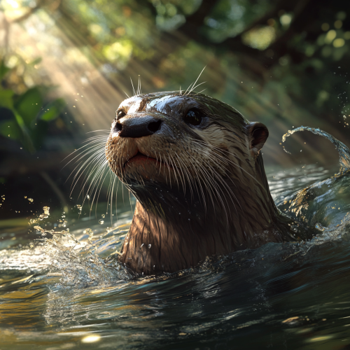 Create a highly realistic image of an Amazonian giant otter (ariranha) swimming in a river. The otter should be shown gliding smoothly through the water, with detailed fur and whiskers that are slightly wet from the river. The surrounding water should be clear, with soft ripples and reflections from the sunlight, creating a natural, serene atmosphere. Include elements of the Amazon environment, such as aquatic plants or riverbank vegetation, to enhance the realism of the scene. The lighting should be natural, capturing the textures of the otter’s fur and the movement of the water in a lifelike way --style raw