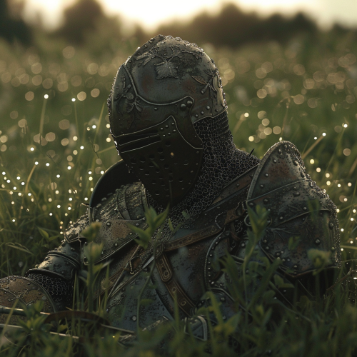 a knight in a field of green, he faces the viewer, it is a beautiful morning sunrise, dew drips on his armor, he is laying down as if he has just won the most important battle of his life, a realistic medieval photo. . aesthetic --v 6.0