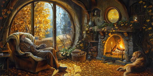a cozy cottage scene depicting a lit fireplace and soft fall color throughout the room, the style of design is from lord of the rings, simple and cozy setting hobbit hole, there is a knight resting facing the fire with his feet propped up, there is a dog laying next to his chair by the fire --v 6.0 --ar 2:1