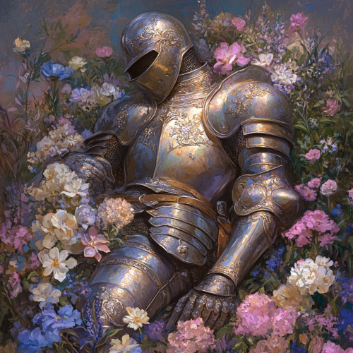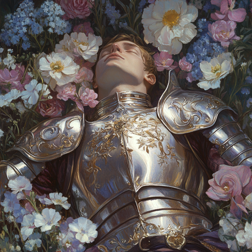 knight in polished, ornately detailed silver armor, lying peacefully on his back, surrounded by blooming flowers of various colors--white, pink, purple, and blue. The armor features intricate engravings and gold accents, with soft reflections from the ambient light. The knight’s face is calm, eyes closed as if in deep rest, with one arm resting across his forehead. The scene is set in a lush floral bed, with the flowers gently cradling the knight, adding a serene and dreamlike atmosphere. The overall mood is tranquil and timeless, with the knight bathed in soft, natural light. The art style is highly detailed, resembling a classical European painting with a fantastical and romantic feel, soft brushstrokes and a painterly quality. The flowers are vivid, with delicate petals contrasting against the cold metal of the armor