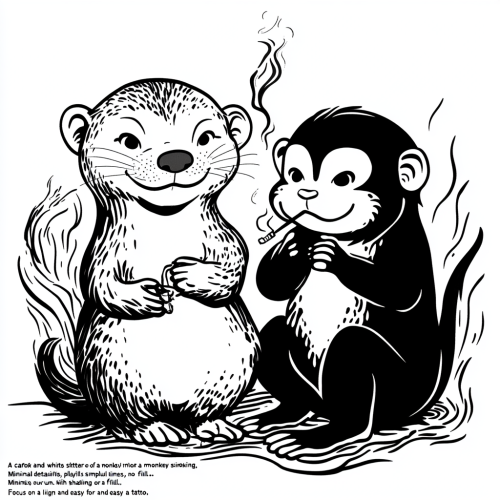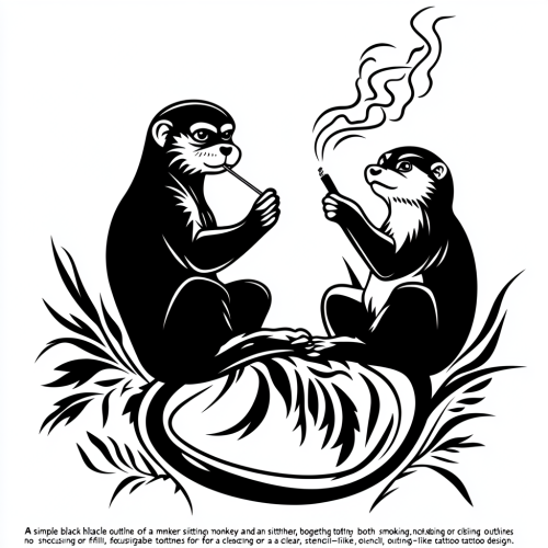 "A cartoonish black and white stencil outline of an otter and a monkey sitting together, both smoking. Minimal details, with simple, playful lines, no shading or fill. Focus on a fun, lighthearted design that’s clean and easy for a tattoo."