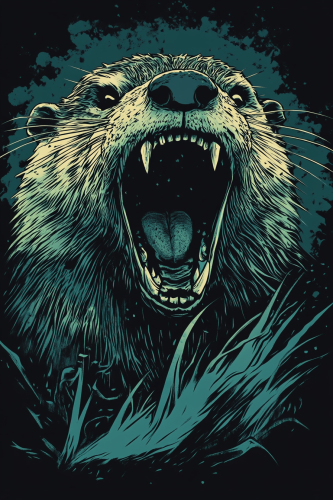 Angry Otter, doom illustration, t-shirt graphic, centered on a plain background, glow, old, dirty, worn, surreal, block colours, block print style, lino print style --ar 2:3