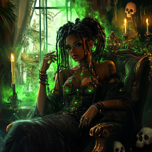 voodoo witch, black, dreadlocks, Cajun atmosphere, wearing Mardi gras dress, new Orleans, wise and beautiful, lounging on throne, candles, green glow, skulls, hoodoo, in the style of seinen, cinematic