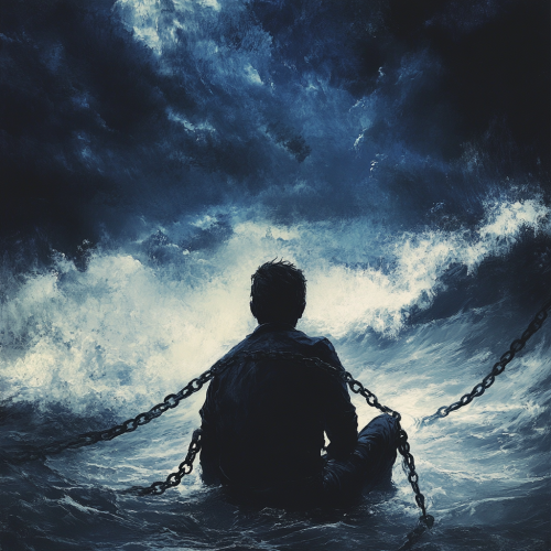 Create an album cover for a song called 'Feeling Strained.' The design should evoke a sense of emotional tension and stress. Picture a scene with a dramatic visual metaphor, such as a person pulling against heavy chains or a stormy sky over a turbulent ocean. Use muted, intense colors like dark blues, grays, and deep reds to enhance the feeling of strain. The album title should be incorporated in a rugged, distressed font that reflects the theme of struggle and intensity.