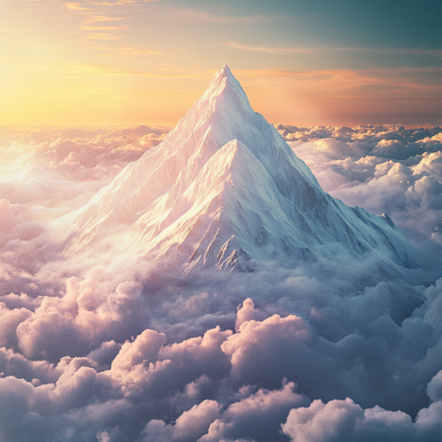 Design an album cover featuring a majestic mountain peak reaching above the clouds. Use dramatic lighting and high-contrast colors to highlight the grandeur and significance of reaching the 'Peak of Existence.