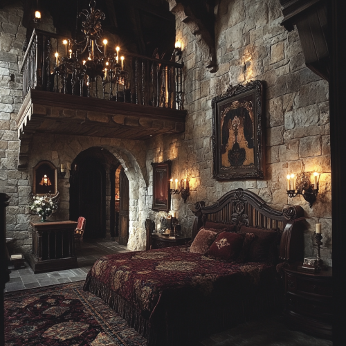 photograph of cozy gothic bedroom, stone walls, candles in wall sconces and chandeliers, plush and ornate upholstery and rugs, tapestries, doors open to large stonework balcony