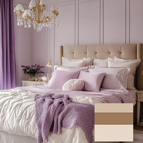 Luxurious, moody chic bedroom with a refined color palette featuring shades of lavender as the main color, soft blush pink as the complementary tone, warm taupe or light brown as the accent, and pure white for the trim. The room should feel opulent yet cozy, with plush bedding, an upholstered headboard, elegant gold or brass fixtures, and soft lighting that enhances the moody ambiance. Add subtle touches of greenery and layered textures like velvet or silk to elevate the space. Aim for a balance of sophistication and warmth, with a hint of airy brightness for a high-end, comfortable look.