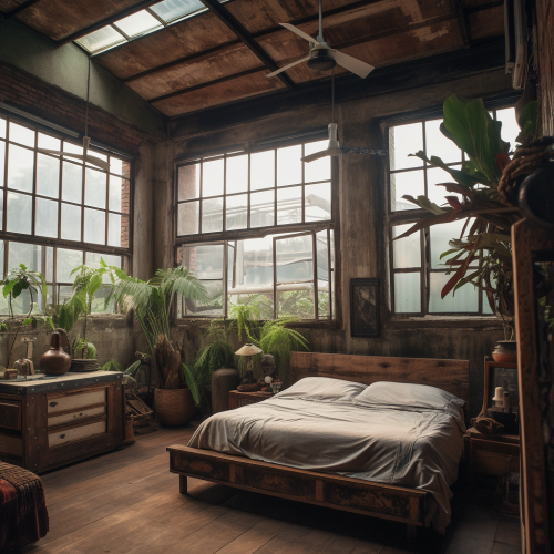 A cozy bedroom on the top floor of a four-story building in an ancient, industrial jungle city with a humid subtropical climate. Rain pours outside, visible through large windows that overlook the dense jungle and ancient, weathered buildings below. The city’s architecture blends indigenous American, particularly Amazonian, heritage with subtle, rustic industrial elements. The room features rough-hewn wood, woven fibers, and vibrant handwoven textiles, with ancient symbols softly glowing on the walls. The atmosphere is warm and inviting, capturing a timeless blend of urban life and deep connection to the surrounding lush environment. --v 5.0