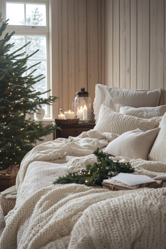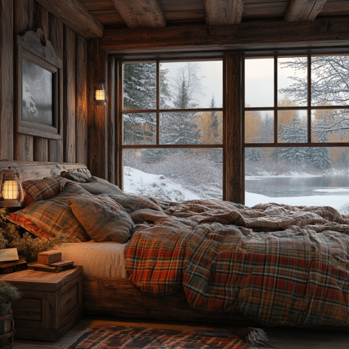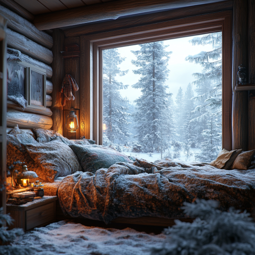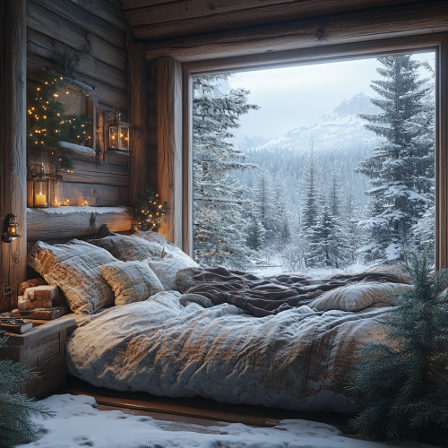 fully furnished bedroom with a really soft cozy and messy matress bed, wood cabin, aesthetic, windows showing snow outside, gloomy lighting, photorealistic --stylize 500 --v 6.1