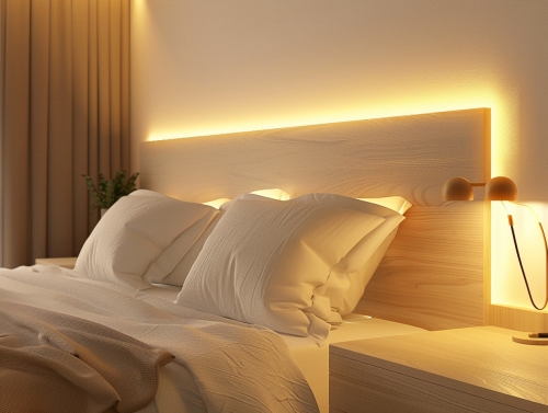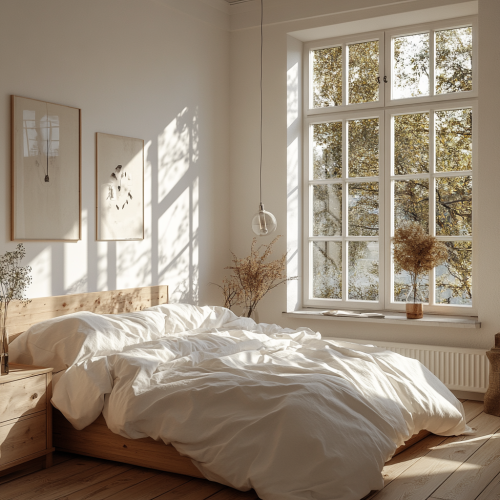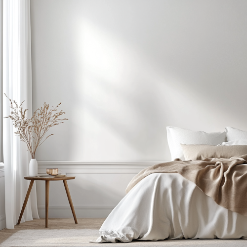 Design an intimate bedroom scene where 80% of the image is filled with a smooth, white wall that is completely clean and evenly lit with soft, warm light. The wall serves as the primary element, providing a flawless canvas for wallpaper. At the far edge of the frame, include a very subtle, blurred hint of a cozy throw blanket draped over the corner of a bed or chair in a neutral, warm color to add a sense of warmth without pulling focus from the wall.
