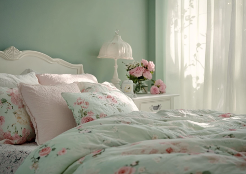 A chic and modern bedroom with a soft pastel green wall color, creating a relaxing and stylish ambiance. The bed is adorned with floral bedding in pink and white, accompanied by a mix of textured pillows in soft shades. A white vintage-style bedside table holds a small vase with pink roses and a classic lamp. The room is bright with natural light streaming through a sheer curtain, enhancing the fresh and elegant decor. Overall, the bedroom is cozy and balanced with contemporary and classic elements. --ar 7:5