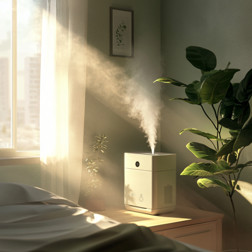A cozy bedroom with a compact air purifier near a plant, creating a fresh and clean ambiance. Soft light from a window illuminates the space, where the air purifier is actively running. The environment appears healthy, with minimal dust, and a soft green color scheme adds to the calm, natural feel.