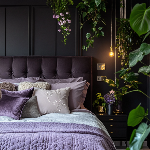A cozy, moody chic bedroom designed with deep lilac walls and soft lavender accents, featuring charcoal gray furniture and touches of dusty rose in decor. Sage green plants add a natural element, with lush potted plants and hanging vines bringing warmth and life to the space. The room is illuminated by soft, warm lighting with ivory white bedding and brass or gold accents for a hint of elegance. Dark wood and matte black finishes enhance the sophisticated, moody aesthetic. Luxurious textures, velvet pillows, and layered rugs complete the cozy ambiance – cinematic lighting, highly detailed, elegant interior design