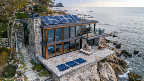 elevated ocean-front home with rooftop solar and large windows, natural light stone walk out basement, on narrow lot, house oriented long on east-west axis, with ocean off to the east, solar panels on south facing rooftop, two story with walk out basement --ar 16:9