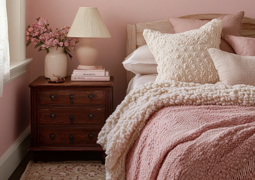 A charming pink boho bedroom featuring soft pink walls, cozy and elegant decor with a vintage feel. A rustic wooden bedside table with an off-white lamp on top, a small vase with pink flowers, and a few stacked books. The bed has textured chunky throws, fluffy pillows, and knit blankets in shades of blush, cream, and beige. The room has a peaceful, cozy ambiance with a bohemian style, combining soft textures and a warm, inviting atmosphere. A subtle, patterned rug is on the floor, and there's a hint of greenery for a fresh touch. --ar 7:5