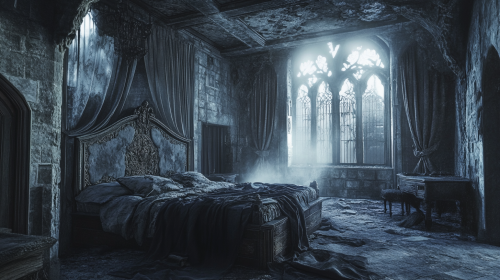 castle master bedroom, medieval, spooky night, midnight, dark, old faded luxury, velvet curtains, filled with mist inside building, floating mist, rotted beds, cracked stone, horror vibe, style of video game concept art, --ar 16:9