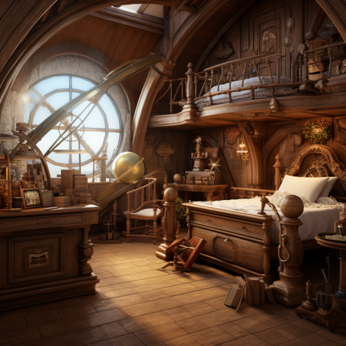 medieval style bedroom with large telescope looking out of window, humble bed, set of drawers, bookshelf, desk, elaborate telescope