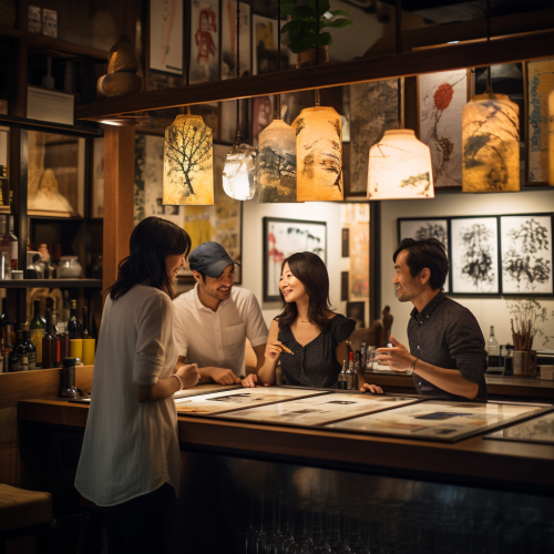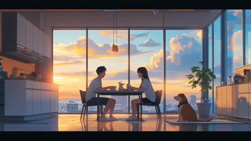 makato shinkai style japanese illustration of a happy pan asian young couple having interesting and fun conversation over breakfast and coffee in their dining table, high rise condominium unit, modern japanese-inspired interiors, behind them is their kitchen and living room, a brown shiba inu is sitting down on the floor, sunrise is seen on their glass window, beautiful clouds, makato shinkai, hayao miyazaki, cinematic lighting, ultra-detailed background --ar 16:9 --v 6.1