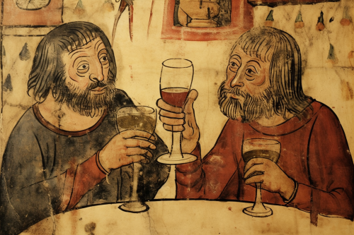 two middle-aged men having a deep conversation over a glass of wine. The artwork is a medieval manuscript illumination, characterized by its vivid colors and intricate details. Stylistically, it displays the typical flatness of perspective and use of bold colors common in medieval European art, with a strong emphasis on line work. The characters are depicted in a stylized manner, with elongated bodies and with exaggerated postures and gestures that convey the narrative. The medium is tempera paint and gold leaf on parchment, There is extensive use of geometric and floral patterns, particularly in the borders and backgrounds. The characters are dressed in contemporary medieval attire. Romanesque art.