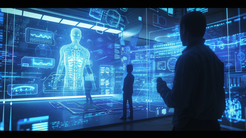 A scene of a human and an ASI avatar engaging in a deep conversation, with holographic data visualizations around them, set in a futuristic, high-tech environment --ar 16:9 --v 6.0