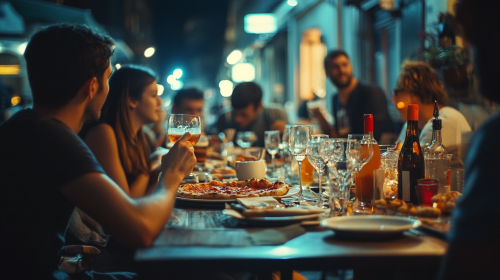 friends having pizza at an italian restaurant in rome. vintage photography. film grain. vintage clothes. rome city center. summer night. drinks. wine. negroni. light color grading with little contrast. --ar 16:9