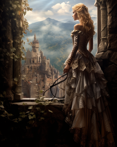 **full body shot of medieval fantasy princess looking out at surreal kingdom, black Mary Jane shoes --ar 4:5 --v 5.2