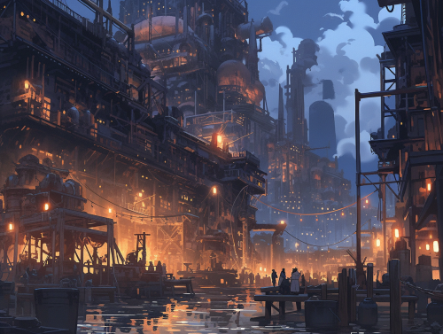 medieval city style, 4K picture quality, masterpieces, gothic streets scenes at night, busy people and machinery, showing a lot of movements activity. Industrial Bourg , factories walls under construction, and the view from the ground level shows the scale of the project --ar 4:3 --stylize 301 --niji 5